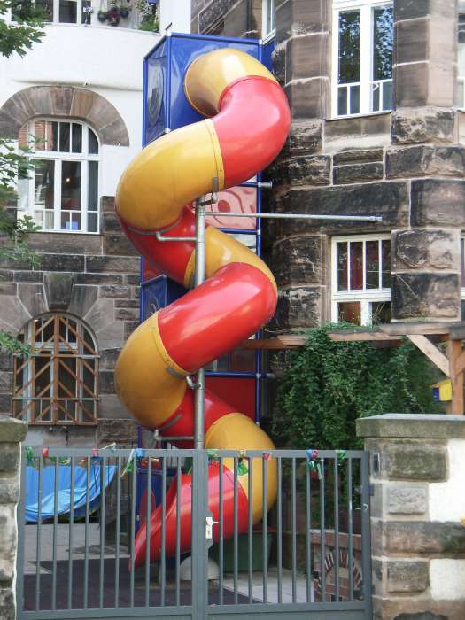 Das am Hang gelegene Gebäude musste in einem städtischen Problemgebiet bei kleinem Grundstück in einen Hort umgebaut werden. Der Brandschutz erfolgt über die Rutsche. Das denkmalgeschützte Haus ist ein Zeugnis wilhelminischen Gemeinsinns der alten, deutschen Kaiserzeit.